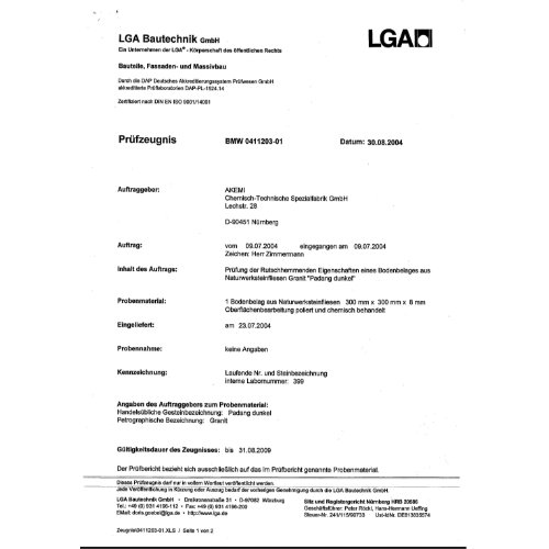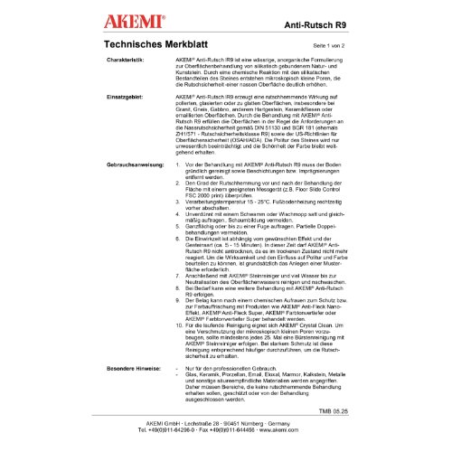 Erzeugt eine rutschhemmende Wirkung auf glatten polierten oder glasierten Oberflächen, insbesondere bei Granit, Gneis, Gabbro, anderem Hartgestein, Keramik- und Feinsteinzeugfliesen sowie emaillierten Oberflächen im Innen- und Außenbereich. Durch die Behandlung mit Anti-Rutsch R9 erfüllen die Oberflächen in der Regel die Anforderungen an die Nassrutschsicherheit gemäß DIN 51130 und BGR 181 (ehemals ZH1/571 – Rutschsicherheitsklasse R9) sowie der US-Richtlinien für Oberflächensicherheit (OSHA/ADA). Die Politur des Steines und die Schönheit der Farbe bleiben weitgehend erhalten. Nachträgliche Schutzimprägnierung mit Anti-Fleck Nano-Effect, Anti-Fleck Super, Farbtonvertiefer oder Farbtonvertiefer Super ist ohne Beeinträchtigung der Rutschsicherheitsklasse R9 möglich (durch LGA Würzburg geprüft).