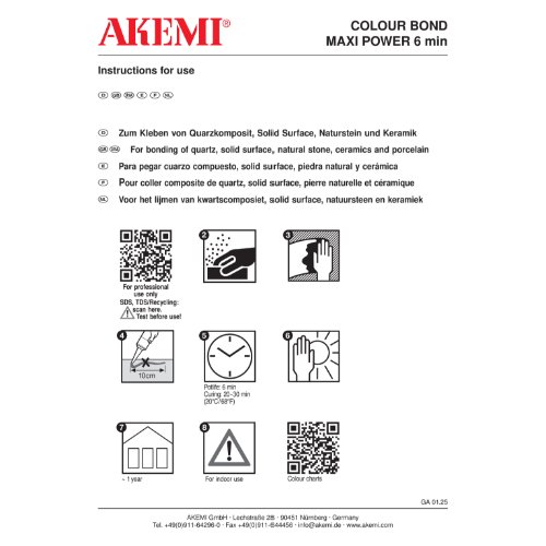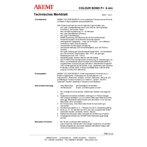 Zur schnellen, einfachen und sicheren Herstellung unsichtbarer Klebefugen bei Quarzkomposit und Naturstein. Die über 50 Colour Bond-Farben sind deckungsgleich mit dem 1-Komponenten-Dichtstoff Composil (gleiche Colour Codes) für Dehnungs- und Anschlussfugen bei Kompositsteinen (AKEMI COLOUR MATCHING SYSTEM).