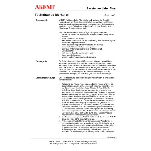 Witterungsbeständiges Produkt mit Langzeitwirkung für innen und außen. Vertieft die Farbe und Struktur von feingeschliffenem und poliertem Stein. Kann mit AKEMI Stone Ink eingefärbt werden, um die Farbe der Steinoberfläche weiter zu intensivieren oder im Farbton zu ändern. Transportiert den Stone Ink Farbstoff in das Porensystem des Steines und reagiert lang anhaltend aus. Für alle feingeschliffenen und polierten, saugfähigen Natur- und Kunststeine, z.B. Marmor, Schiefer, Solnhofener Platten, Sandstein, Granit, Gneis oder Betonwerkstein geeignet.
