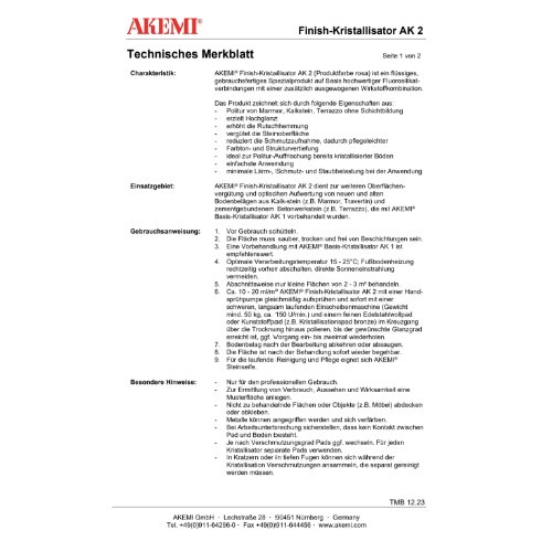Zur Oberflächenvergütung von neuen und alten Bodenbelägen aus Kalkstein (z.B. Marmor, Travertin) oder zementgebundenem Betonwerkstein (z.B. Terrazzo), die mit AKEMI Basis-Kristallisator AK1 vorbehandelt wurden. Durch eine chemische Reaktion wird die Verschleißfestigkeit der Oberfläche zusätzlich erhöht; eine aus gewogene Wirkstoffkombination führt zu nochmaliger Glanzsteigerung mit Farbtonvertiefung und gleichzeitiger Rutschhemmung. Mattflecken oder Laufstraßen können durch wiederholte Kristallisation auspoliert werden.