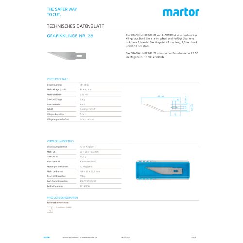 Die GRAFIKKLINGE NR. 28 von MARTOR ist eine hochwertige Klinge aus Stahl. Sie ist sehr scharf und verfügt über eine nutzbare Schneide. Die Klinge ist 47 mm lang, 9,3 mm breit und 0,63 mm stark.