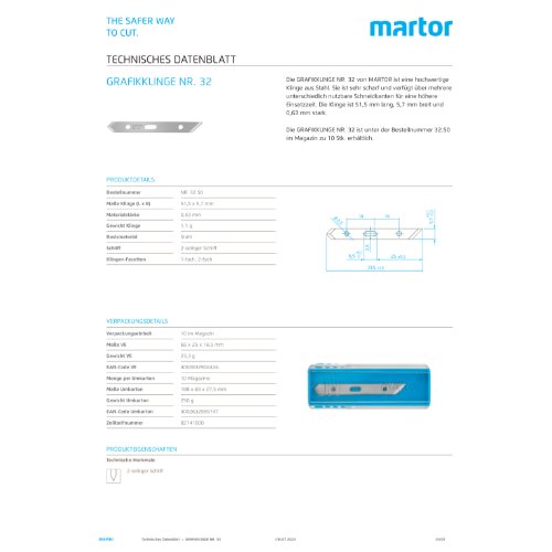 Die GRAFIKKLINGE NR. 32 ist unter der Bestellnummer 32.50 im Magazin zu 10 Stk. erhältlich. Sie können die Klinge in den folgenden MARTOR-Messern einsetzen: GRAFIX PICCOLO.