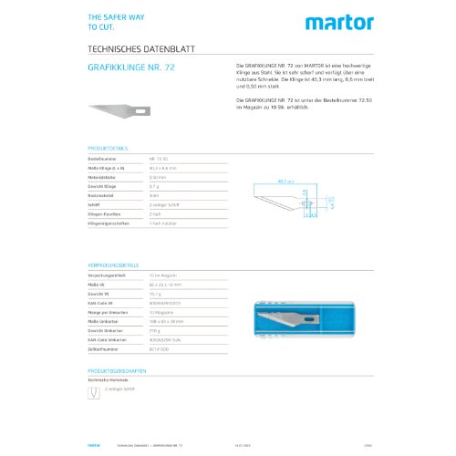 Die GRAFIKKLINGE NR. 72 ist unter der Bestellnummer 72.50 im Magazin zu 10 Stk. erhältlich. Sie können die Klinge in den folgenden MARTOR-Messern einsetzen: GRAFIX BOY, TRIMMEX CUTTOGRAF.