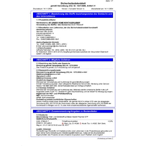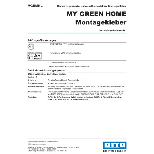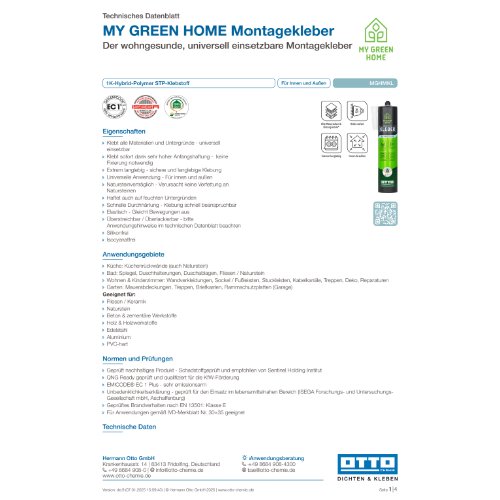 TITEL: MY GREEN HOME Montagekleber - Der wohngesunde, universell einsetzbare Montagekleber###ANWENDUNGSGEBIETE: Küche: Küchenrückwände (auch Naturstein);Bad: Spiegel, Duschhalterungen, Duschablagen, Fliesen / Naturstein;Wohnen und Kinderzimmer: Wandverkleidungen, Sockel / Fußleisten, Stuckleisten, Kabelkanäle, Treppen, Deko, Reparaturen;Garten: Mauerabdeckungen, Treppen, Briefkasten, Rammschutzplatten (Garage);Geeignet für:;Fliesen / Keramik;Naturstein;Beton und zementäre Werkstoffe;Holz und Holzwerkstoffe;Edelstahl;Aluminium;PVC-hart###EIGENSCHAFTEN: Klebt alle Materialien und Untergründe - universell einsetzbar;Klebt sofort dank sehr hoher Anfangshaftung - keine Fixierung notwendig;Extrem langlebig - sichere und langlebige Klebung;Universelle Anwendung - Für innen und außen;Natursteinverträglich - Verursacht keine Verfettung an Natursteinen;Haftet auch auf feuchten Untergründen;Schnelle Durchhärtung - Klebung schnell beanspruchbar;Elastisch - Gleicht Bewegungen aus;Überstreichbar / Überlackierbar - bitte Anwendungshinweise im technischen Datenblatt beachten;Silikonfrei;Isocyanatfrei###NORMEN UND PRÜFUNGEN: Geprüft nachhaltiges Produkt - Schadstoffgeprüft und empfohlen von Sentinel Holding Institut;QNG Ready geprüft und qualifiziert für die KfW-Förderung;EMICODE® EC 1 Plus - sehr emissionsarm;Unbedenklichkeitserklärung - geprüft für den Einsatz im lebensmittelnahen Bereich (ISEGA Forschungs- und Untersuchungs-Gesellschaft mbH, Aschaffenburg);Geprüftes Brandverhalten nach EN 13501: Klasse E;Für Anwendungen gemäß IVD-Merkblatt Nr. 30+35 geeignet