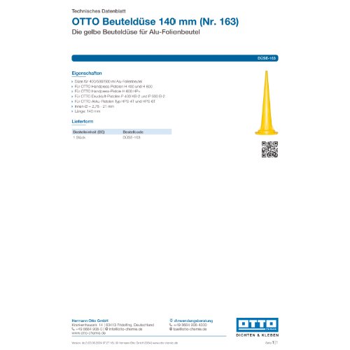 TITEL: OTTO Beuteldüse 140 mm (Nr. 163) - Die gelbe Beuteldüse für Alu-Folienbeutel###EIGENSCHAFTEN: Düse für 400/580/600 ml Alu-Folienbeutel;Für OTTO Handpress-Pistolen H 400 und H 600;Für OTTO Handpress-Pistole H 600 HP+;Für OTTO Druckluft-Pistolen P 400 KB-2 und P 600 B-2;Für OTTO Akku-Pistolen Typ HPS-4T und HPS-6T;Innen-Ø = 2,75 - 21 mm;Länge: 140 mm