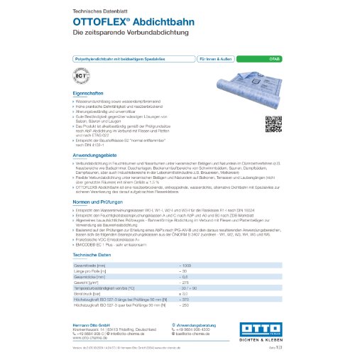 TITEL: OTTOFLEX® Abdichtbahn - Die zeitsparende Verbundabdichtung###ANWENDUNGSGEBIETE: Verbundabdichtung in Feuchträumen und Nassräumen unter keramischen Belägen und Naturstein im Dünnbettverfahren (z.B. Nassbereiche wie Badezimmer, Duschanlagen, Beckenumlaufbereiche von Schwimmbädern, Saunen, Dampfbädern, Dampfsaunen, aber auch Industriebereiche in der Lebensmittelindustrie z.B. Brauereien, Molkereien);Flexible Verbundabdichtung unter keramischen Belägen und Naturstein auf Balkonen, Terrassen und Laubengängen (nicht über genutzten Räumen) mit einem Gefälle ≥ 1,5 %;OTTOFLEX® Abdichtbahn ist eine rissüberbrückende, entkoppelnde, wasserdichte, alternative Dichtbahn mit Spezialvlies zur sicheren Verankerung des darauf aufgebrachten Fliesenklebers###EIGENSCHAFTEN: Wasserundurchlässig sowie wasserdampfbremsend;Hohe praktische Dehnfähigkeit und rissüberbrückend;Alterungsbeständig und unverrottbar;Gute Beständigkeit gegenüber wässrigen Lösungen von Salzen, Säuren und Laugen;Das Produkt ist alkalibeständig gemäß der Prüfgrundsätze nach AbP Abdichtung im Verbund mit Fliesen und Platten und nach ETAG 022;Entspricht der Baustoffklasse B2 "normal entflammbar" nach DIN 4102-1###NORMEN UND PRÜFUNGEN: Entspricht den Wassereinwirkungsklassen W0-I, W1-I, W2-I und W3-I für die Rissklasse R1-I nach DIN 18534;Entspricht den Feuchtigkeitsbeanspruchungsklassen A und C nach AbP und A0 und B0 nach ZDB-Merkblatt;Allgemeines bauaufsichtliches Prüfzeugnis - Bahnenförmige Abdichtung im Verbund mit Fliesen und Plattenbelägen zur Verwendung als Bauwerksabdichtung;Basierend auf den Prüfungen zur Erteilung eines AbP`s nach PG-AIV-B und den daraus resultierenden Anwendungsbereichen, lassen sich die folgenden Beanspruchungsklassen aus der ÖNORM B 3407 zuordnen - W1, W2, W3, W4, W5 und W6.;Französische VOC-Emissionsklasse A+;EMICODE® EC 1 Plus - sehr emissionsarm