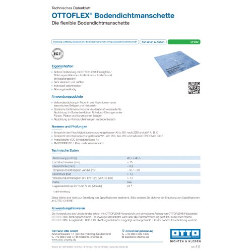 TITEL: OTTOFLEX® Bodendichtmanschette - Die flexible Bodendichtmanschette###ANWENDUNGSGEBIETE: Verbundabdichtung in Feucht- und Nassräumen unter keramischen Belägen und Naturstein;Elastische Dichtmanschette für die dauerhaft wasserdichte Abdichtung im Bodenbereich an Rohrdurchführungen unter Fliesen, Platten und keramischen Belägen;Abdichtung an Rohrdurchführungen im Bodenbereich###EIGENSCHAFTEN: Sichere Verbindung mit OTTOFLEX® Flüssigfolie / Dichtungsschlämme / Abdichtbahn / Abdicht- und Entkopplungsbahn;Sehr elastisch und reißfest;Individuell zuschneidbar;Alterungsbeständig###NORMEN UND PRÜFUNGEN: Entspricht den Feuchtigkeitsbeanspruchungsklassen A0 u. B0 nach ZDB und abP A, B, C;Entspricht den Beanspruchungsklassen W1, W2, W3, W4, W5 und W6 nach ÖNORM B 3407;Französische VOC-Emissionsklasse A+;EMICODE® EC 1 Plus - sehr emissionsarm