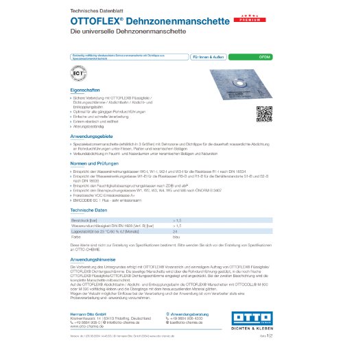 TITEL: OTTOFLEX® Dehnzonenmanschette - Die universelle Dehnzonenmanschette###ANWENDUNGSGEBIETE: Spezialelastomermanschette (erhältlich in 3 Größen) mit Dehnzone und Dichtlippe für die dauerhaft wasserdichte Abdichtung an Rohrdurchführungen unter Fliesen, Platten und keramischen Belägen;Verbundabdichtung in Feucht- und Nassräumen unter keramischen Belägen und Naturstein###EIGENSCHAFTEN: Sichere Verbindung mit OTTOFLEX® Flüssigfolie / Dichtungsschlämme / Abdichtbahn / Abdicht- und Entkopplungsbahn;Optimal für alle gängigen Rohrdurchführungen;Einfache und schnelle Verarbeitung;Extrem elastisch und reißfest;Alterungsbeständig###NORMEN UND PRÜFUNGEN: Entspricht den Wassereinwirkungsklassen W0-I, W1-I, W2-I und W3-I für die Rissklasse R1-I nach DIN 18534;Entspricht der Wassereinwirkungsklasse W1-B für die Rissklassen R0-B und R1-B für die Behälterstandorte S1-B und S2-B nach DIN 18535;Entspricht den Feuchtigkeitsbeanspruchungsklassen nach ZDB und abP;Entspricht den Beanspruchungsklassen W1, W2, W3, W4, W5 und W6 nach ÖNORM B 3407;Französische VOC-Emissionsklasse A+;EMICODE® EC 1 Plus - sehr emissionsarm