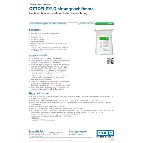 TITEL: OTTOFLEX® Dichtungsschlämme - Die hoch beanspruchbare Verbundabdichtung###ANWENDUNGSGEBIETE: Für die Anwendung im Innen- und Außenbereich;Flexible Verbundabdichtung unter keramischen Belägen und Naturstein in Feuchträumen und Nassräumen;Flexible Verbundabdichtung unter keramischen Belägen und Naturstein auf Balkonen, Terrassen und Laubengängen (nicht über genutzten Räumen) mit einem Gefälle ≥ 1,5 %;Bauwerksabdichtung von erdberührten Bauteilen gegen Bodenfeuchte und nicht drückendes Wasser z.B. Kelleraußenwände und Stützmauern;Zur Abdichtung von Schwimmbecken und Wasserbehältern aus massiver Bauweise im Innen- und Außenbereich, freigegeben bis 4 m Wassertiefe;Geeignet für Untergründe mit ausreichender Festigkeit wie Gipskarton, Gipsfaser, Estrich, Heizestrich, Beton, Mauerwerk, Porenbeton und Putz der Mörtelgruppe II und III;In stark nass beanspruchten Bereichen entsprechend den Beanspruchungsklassen A und B der Bauregelliste###EIGENSCHAFTEN: Einkomponentige flexible Verbundabdichtung - schnellhärtend;Rissüberbrückend;Sehr gut verarbeitbar;Rissfreie Aushärtung;Wasserdicht und dampfdiffusionsoffen im ausgehärteten Zustand;Frost- und alterungsbeständig im ausgehärteten Zustand;Entspricht der Baustoffklasse B2 "normal entflammbar" nach DIN 4102-1###NORMEN UND PRÜFUNGEN: Allgemeines bauaufsichtliches Prüfzeugnis - Flüssige Abdichtung im Verbund mit Fliesen und Plattenbelägen zur Verwendung als Bauwerksabdichtung;Entspricht den Wassereinwirkungsklassen W0-I, W1-I, W2-I und W3-I für die Rissklasse R1-I nach DIN 18534;Entspricht der Wassereinwirkungsklasse W1-B für die Rissklassen R0-B und R1-B für die Behälterstandorte S1-B und S2-B nach DIN 18535;Erfüllt die Beanspruchungsklassen A und B nach abP;Erfüllt die Feuchtigkeitsbeanspruchungsklassen A0 und B0 nach ZDB-Merkblatt;Basierend auf den Prüfungen zur Erteilung eines AbP`s nach PG-AIV-F und den daraus resultierenden Anwendungsbereichen, lassen sich die folgenden Beanspruchungsklassen aus der ÖNORM B 3407 zuordnen - W1, W2, W3, W4, W5 (ausgenommen Bereiche mit erhöhter chemischer Beanspruchung) und W6.;Wasserundurchlässigkeit geprüft gemäß DIN EN 14891, Tabelle 1;GISCODE ZP1;Französische VOC-Emissionsklasse A+
