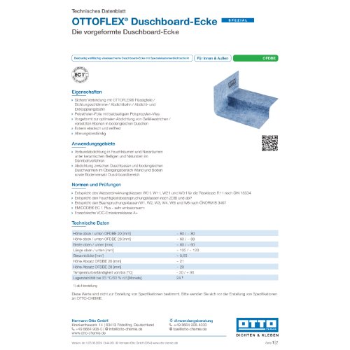 TITEL: OTTOFLEX® Duschboard-Ecke - Die vorgeformte Duschboard-Ecke###ANWENDUNGSGEBIETE: Verbundabdichtung in Feuchträumen und Nassräumen unter keramischen Belägen und Naturstein im Dünnbettverfahren;Abdichtung zwischen Duschtassen und bodengleichen Duschwannen im Übergangsbereich Wand und Boden sowie Bodenversatz Duschboardbereich###EIGENSCHAFTEN: Sichere Verbindung mit OTTOFLEX® Flüssigfolie / Dichtungsschlämme / Abdichtbahn / Abdicht- und Entkopplungsbahn;Polyethylen-Folie mit beidseitigem Polypropylen-Vlies;Vorgeformt zur optimalen Abdichtung von Gefälleestrichen / versetzten Ebenen in bodengleichen Duschen;Extrem elastisch und reißfest;Alterungsbeständig###NORMEN UND PRÜFUNGEN: Entspricht den Wassereinwirkungsklassen W0-I, W1-I, W2-I und W3-I für die Rissklasse R1-I nach DIN 18534;Entspricht den Feuchtigkeitsbeanspruchungsklassen nach ZDB und abP;Entspricht den Beanspruchungsklassen W1, W2, W3, W4, W5 und W6 nach ÖNORM B 3407;EMICODE® EC 1 Plus - sehr emissionsarm;Französische VOC-Emissionsklasse A+