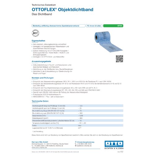 TITEL: OTTOFLEX® Objektdichtband - Das Dichtband###ANWENDUNGSGEBIETE: Verbundabdichtung in Feucht- und Nassräumen unter keramischen Belägen und Naturstein;Abdichtung an den Stoßkanten bzw. Bauteilübergängen;Abdichten in der Eckausbildung zur Überbrückung von Rissen und Fugen###EIGENSCHAFTEN: Sehr elastisch, alterungsbeständig und reißfest;Verträglich mit handelsüblichen Fliesenklebern und lösemittelfreien Beschichtungen;Sichere Verbindung mit OTTOFLEX® Flüssigfolie / Dichtungsschlämme / Abdichtbahn / Abdicht- und Entkopplungsbahn;Verträglich mit OTTO Dicht- und Klebstoffen###NORMEN UND PRÜFUNGEN: Entspricht den Wassereinwirkungsklassen W0-I, W1-I, W2-I und W3-I für die Rissklasse R1-I nach DIN 18534;Entspricht der Wassereinwirkungsklasse W1-B für die Rissklassen R0-B und R1-B für die Behälterstandorte S1-B und S2-B nach DIN 18535;Entspricht den Feuchtigkeitsbeanspruchungsklassen A0 u. B0 nach ZDB und abP A, B, C;Entspricht den Beanspruchungsklassen W1, W2, W3, W4, W5 und W6 nach ÖNORM B 3407;Geprüft nach DIN EN 1928 (Version B) Prüfung der Wasserundurchlässigkeit;Französische VOC-Emissionsklasse A+;EMICODE® EC 1 Plus - sehr emissionsarm