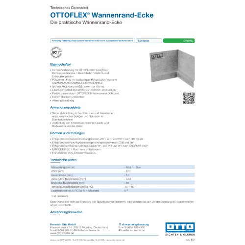 TITEL: OTTOFLEX® Wannenrand-Ecke - Die praktische Wannenrand-Ecke###ANWENDUNGSGEBIETE: Verbundabdichtung in Feuchträumen und Nassräumen unter keramischen Belägen und Naturstein im Dünnbettverfahren;Abdichtung von Innenecken zwischen Dusch- und Badewanne und der Wand###EIGENSCHAFTEN: Sichere Verbindung mit OTTOFLEX® Flüssigfolie / Dichtungsschlämme / Abdichtbahn / Abdicht- und Entkopplungsbahn;Polyethylen-Folie mit beidseitigem Polypropylen-Vlies und selbstklebenden Streifen aus Butylkautschuk;Sichere Abdichtung im Eckbereich der Wanne;Einseitiger Selbstklebestreifen zur einfachen Verarbeitung;Perfekt passend zum OTTOFLEX® Wannenrand-Dichtband;Extrem elastisch und reißfest;Alterungsbeständig###NORMEN UND PRÜFUNGEN: Entspricht den Wassereinwirkungsklassen W0-I, W1-I und W2-I nach DIN 18534;Entspricht den Feuchtigkeitsbeanspruchungsklassen nach ZDB und abP;Entspricht den Beanspruchungsklassen W1, W2, W3 und W4 nach ÖNORM B 3407;EMICODE® EC 1 Plus - sehr emissionsarm;Französische VOC-Emissionsklasse A+