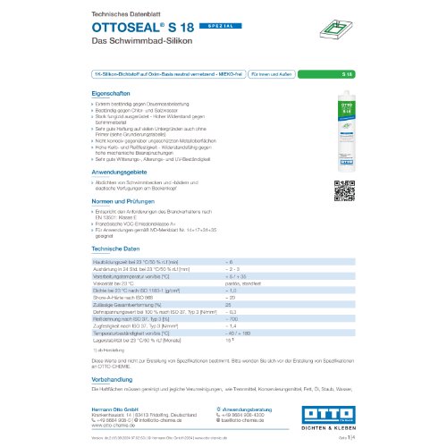 TITEL: OTTOSEAL® S 18 - Das Schwimmbad-Silikon###BESCHREIBUNG: Das Schwimmbad-Silikon OTTOSEAL® S 18 ist ein Spezial-Dichtstoff, der extra für Anwendungen im und am Schwimmbecken entwickelt wurde. Durch seine hohe Beständigkeit gegen die Belastung durch Chlor und Desinfektionsmittel und gegen mechanische Beanspruchungen, sowie seine hohe Schimmelbeständigkeit, ist dieser Dichtstoff perfekt für Fugen im Dauernassbereich geeignet. Und das nicht nur am Beckenrand, sondern auch unter Wasser.###ANWENDUNGSGEBIETE: Abdichten von Schwimmbecken und -bädern und elastische Verfugungen am Beckenkopf###EIGENSCHAFTEN: Extrem beständig gegen Dauernassbelastung;Beständig gegen Chlor- und Salzwasser;Stark fungizid ausgerüstet - Hoher Widerstand gegen Schimmelbefall;Sehr gute Haftung auf vielen Untergründen auch ohne Primer (siehe Grundierungstabelle);Nicht korrosiv gegenüber ungeschützten Metalloberflächen;Hohe Kerb- und Reißfestigkeit - Widerstandsfähig gegen hohe mechanische Beanspruchungen;Sehr gute Witterungs-, Alterungs- und UV-Beständigkeit###NORMEN UND PRÜFUNGEN: Entspricht den Anforderungen des Brandverhaltens nach EN 13501: Klasse E;Französische VOC-Emissionsklasse A+;Für Anwendungen gemäß IVD-Merkblatt Nr. 14+17+31+35 geeignet