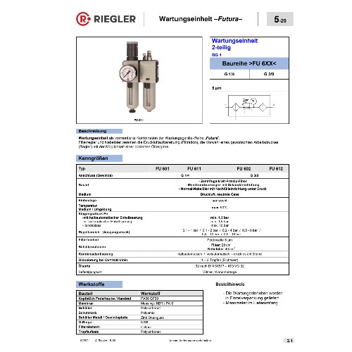 Wartungseinheit 2-tlg. »FUTURA«, PC-Behälter, Schutzkorb und Manometer, BG 1, G 3/8, Regelbereich 0,5-10 bar, Kondensatablass: HA. Zweiteilige Wartungseinheiten in modernem Design und mit hervorragenden Durchflusswerten. Arretierbarer und abschließbarer Membrandruckregler mit Sekundärentlüftung. Öleinfüllung während des Betriebs möglich.