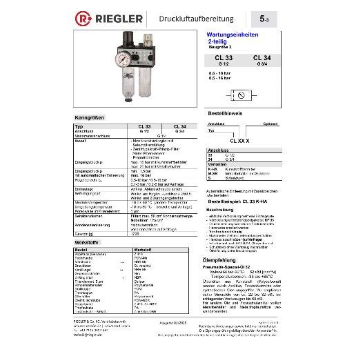 Wartungseinheit 2-tlg. »multifix« mit Polycarbonatbehälter, BG 3, G 1/2, Eingangsdruck max. 16 bar, Regelbereich 0,5 - 10 bar. Zweiteilige Wartungseinheiten, bestehend aus einem vordruckunabhängigen, rücksteuerbaren Membrandruckregler mit Sekundärentlüftung in Verbindung mit einem Zentrifugalabscheider und einem Proportionalöler.