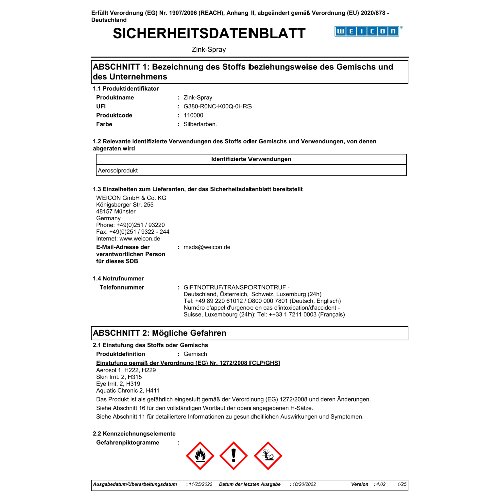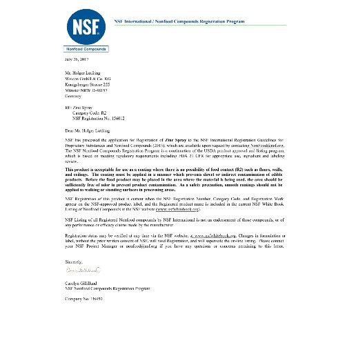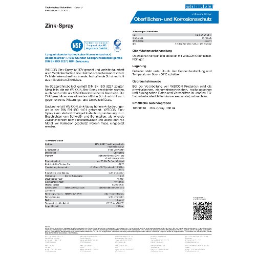 für alle Metalloberflächen · bildet eine schnelltrocknende, festhaftende und widerstandsfähige Schutzschicht, auch gegen extreme Witterungs- und Umwelteinflüsse · erfüllt höhere Anforderungen als in der DIN EN ISO 1461 gefordert · überlackierbar · >1050 Stunden Salzsprühnebeltest gemäß DIN EN ISO 9227 · TÜV-geprüft · kann als hochwertige Rostschutzgrundierung, zum Beschichten von Schweiß- und Bohrstellen, als leitende Zwischenschicht beim Punktschweißen und überall dort, wo Metall vor Korrosion geschützt werden muss, eingesetzt werden · NSF R2 registriert (Reg.-Nr. 156012) Weitere technische Eigenschaften: · Farbe: leicht angewitterte Feuerverzinkung, ähnlich RAL 9006 · Gebinde: Spraydose · Abriebfest: ja · Bindemittel-Typ: Styrolalkyd · durchgehärtet nach: 12 min · IMPA-Code: 450811 · ISSA-Code: 53.402.06 · Lagerfähigkeit in Monaten: 24 mo · Verarbeitungstemperatur: +5 bis +35, optimal +18 bis +25 °C · Überlackierbar: 24 Std.
